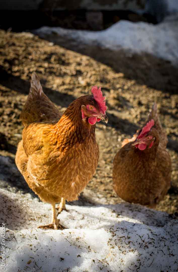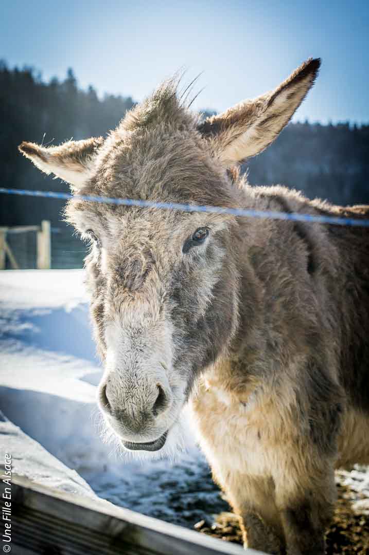 Après quelques mètres, une fois sortie de la forêt, la neige est de retour. Et la en plein soleil, c’est du pur bonheur. Nous arrivons près d’un gîte qui à l’air bien sympa, il y a un âne et des poules. Forcément je vais lui faire un coucou et l’embêter durant sa sieste pour lui tirer le portrait à celui là !