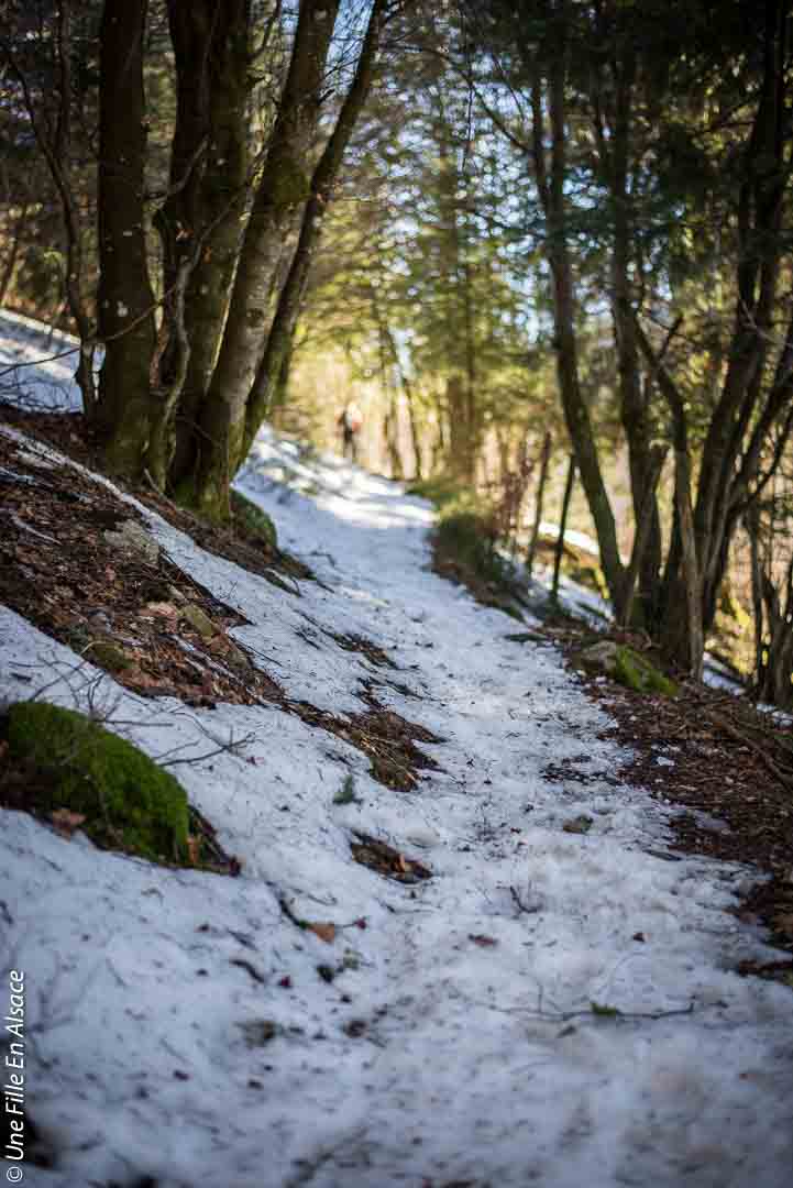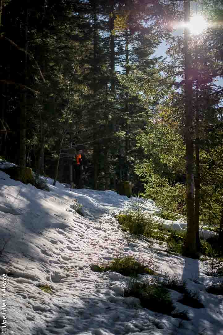 Le point de départ de la balade se situe au niveau du parking, sur la droite en arrivant au domaine de l’Ermitage du Frère Joseph. Nous empruntons le chemin le plus à droite qui s’enfonce dans la forêt. Cette première partie de balade est tranquille pour démarrer et se mettre en jambe. Elle est à l’ombre, il y a donc suffisamment de neige. Cela ne durera que quelques centaines de mètres, puisque rapidement nous nous retrouvons en plein soleil, et sur une route… La neige a fondu. Nous sommes obligés de déchausser nos raquettes. Les dernières chutes de neige datent d’il y a au moins 15 jours 3 semaines, et bien qu’elles aient été abondantes, le radoucissement de l’air, fait que par endroit nous avons dû déchausser plusieurs fois. L’avantage de la raquette, c’est qu’on peut toujours continuer la balade à pied !