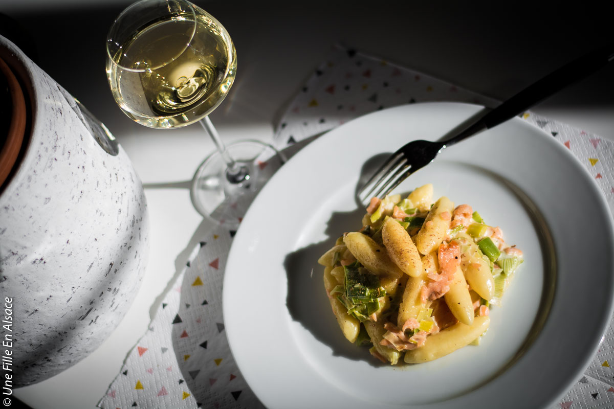 Envie de faire plaisir à ton ou ta Schotz* pour le dîner de ce soir ? Je te suggère des gnocchis à l’alsacienne au saumon et au poireau. Accompagné d’un verre de Riesling, tu vas faire un tabac, c’est promis juré !!
