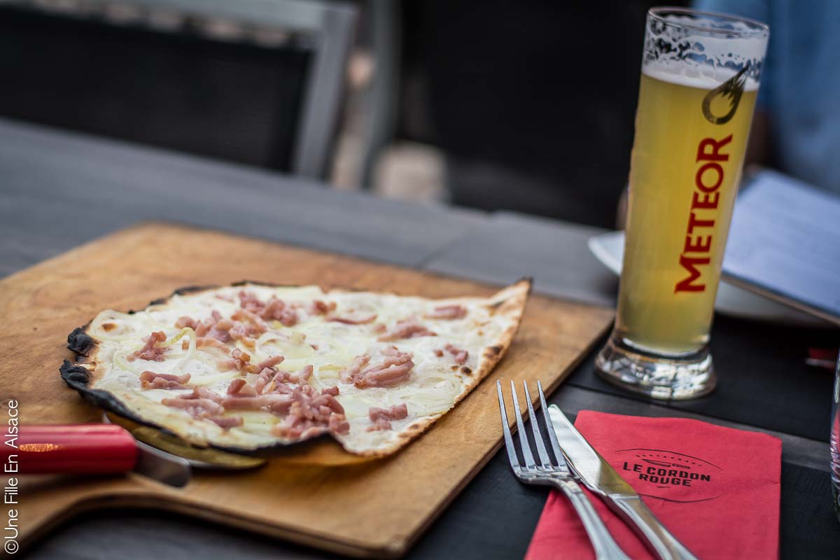 Le Cordon Rouge propose en bonne table alsacienne, une cuisine locale et traditionnelle. On pourra déguster entre autre une très bonne tarte flambée. On s’est laissé tenté par une demie pour l’apéro. J’en ai déjà goûté pas mal, parce que j’adore ça, et celle-ci fait partie des meilleures que j’ai testé : une pâte fine et croquante, de la crème, des lardons et des oignons juste ce qu’il faut ! Ensuite je me suis régalée avec des galettes de pommes de terre au munster et quelques crudités.